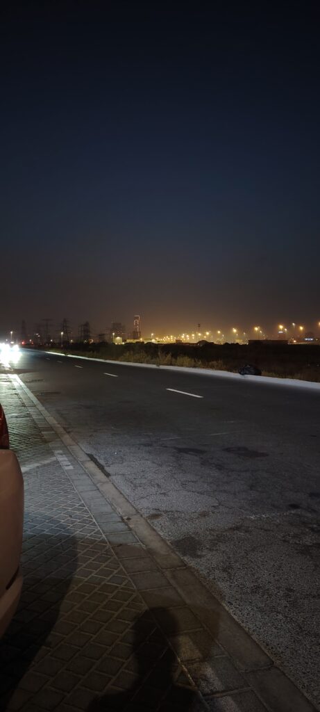 This stunning capture from the heart of **Jabal Ali Road, Dubai**, offers a unique contrast between motion and stillness—between distant city lights and the quiet stretch of asphalt ahead.