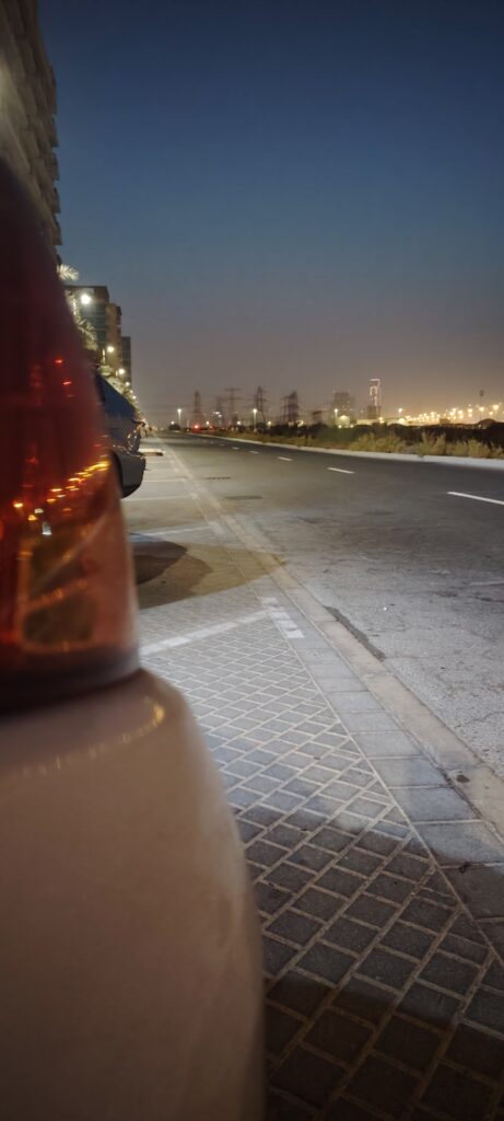 The photograph, taken just after sunset, paints the sky in deep hues of twilight, blending beautifully with the glowing golden cityscape in the background. Illuminated by countless streetlights and distant high-rises, the horizon subtly reminds us of Dubai’s non-stop energy. The left side of the image includes part of a parked car and its shadow cast across the patterned sidewalk, grounding the viewer in the present moment.